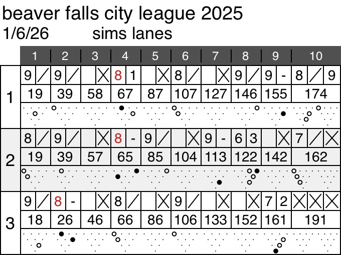 The team we bowled was 1 spot ahead of us but they bowled pretty good tonight, especially game 3. I think they were about 150 over their average. They had a 1044 scratch with an 890 average. We lost 2 of 3 but deserved it for the way we bowled.