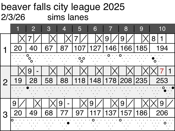 Game 2: 253 (9 strikes, 0 spares, 2 opens-1 split)