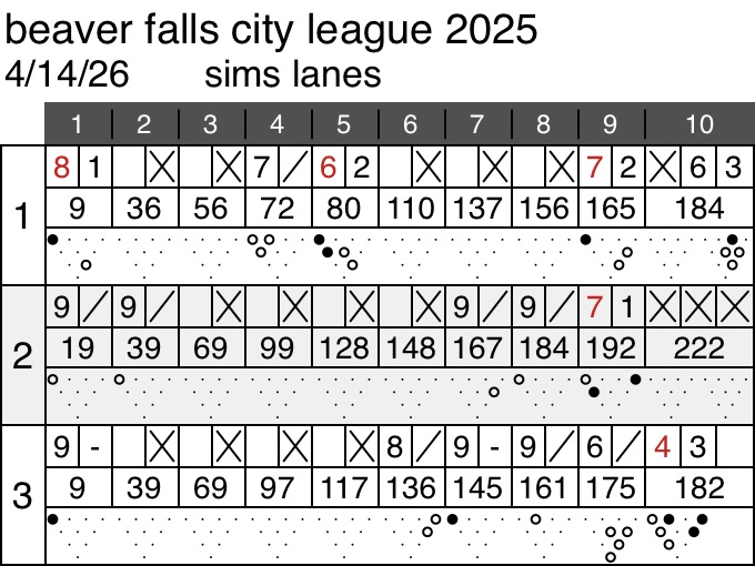 Next week is final position round then the following week is our end of season tournament. We are in 3rd so bowl the 4th place team next week on the same pair we were on tonight. Mathematically we still have a shot at winning this last 3rd. The first place team already won a 3rd and as per rules a team can't win more than 1 so they are out of the picture. If the 1st place team beats the 2nd place team all 3 games next week and we win all 3 then we will win the final 3rd. But we need to figure out our game 3 issues.